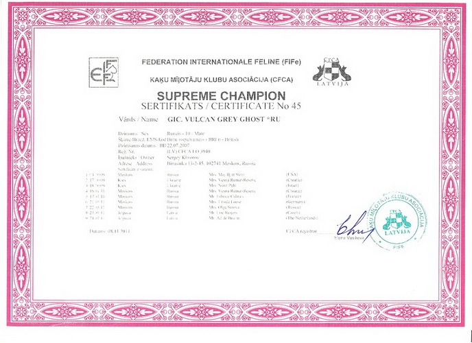 Вулкан на даче |  Суприм-Чемпион Европы - высший титул - Сертификат | |